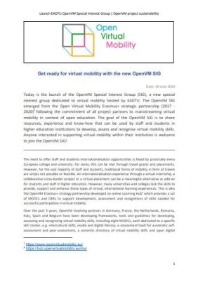 On 9 December at 12.00 CET the Special Interest Group on Open Virtual Mobility will come together for the first time. The Special Interest Group is to sustain all the project outcomes and products for the following 5 years beyond the lifetime of the project and monitor their uptake.